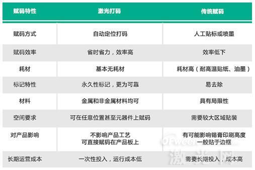 下表为PCB电路板激光打标方式和传统赋码方式的优劣势对比